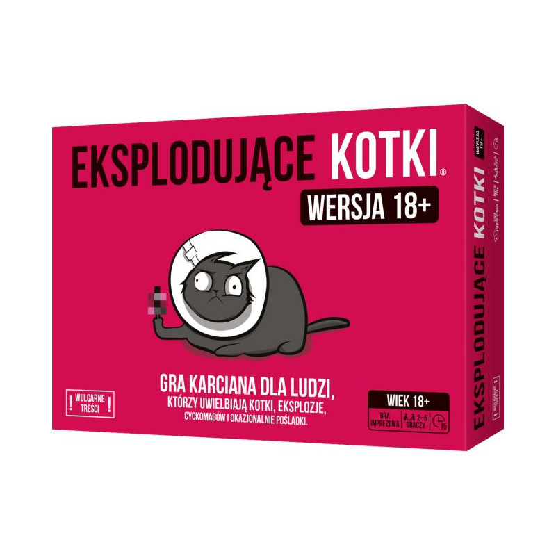 Dlaczego pokochasz tę grę? Eksplodujące Kotki to kultowy projekt wśród gier oryginalnie wydanych przez kampanie crowdfundingowe. W 2015 roku ponad 219 000 osób wsparło to miauczące szaleństwo! Jeśli kochasz gry pełne negatywnej interakcji i złośliwych zagrywek, to zabawa dla Ciebie. Na szali leży odpadnięcie z gry, więc zawsze walczycie o wysoką stawkę! Wersja dla dorosłych to jeszcze czarniejszy humor więcej brudnych żartów! Jeśli posiadasz już podstawową wersję Eksplodujących Kotków, możesz połączyć ją z zestawem dla dorosłych, dzięki czemu do wspólnej zabawy będzie mogło zasiąść aż 9 osób.