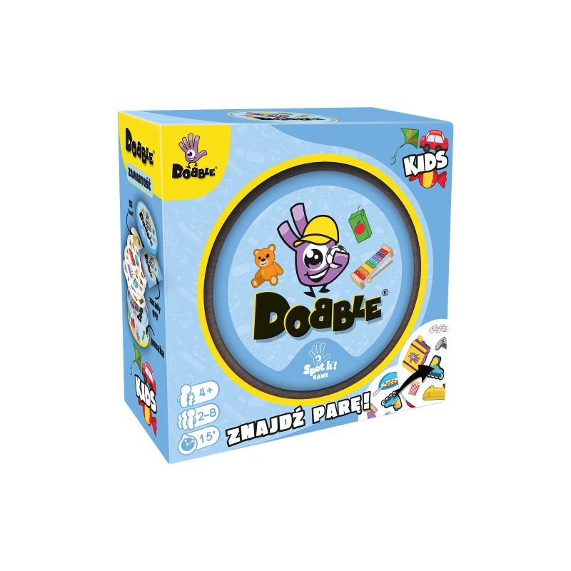 Dobble Kids to gra wspierająca trening spostrzegawczości i szybkości reakcji, w pełni dostosowana do potrzeb najmłodszych. Zestaw zawiera 55 kart z symbolami przedstawiającymi przedmioty i zabawki, którymi dzieci bawią się każdego dnia. Miś, plecak, piłka, rower, lalka – proste obrazki łatwiej nazwać, dzięki czemu możemy zaprosić do zabawy dzieci od 4. roku życia.