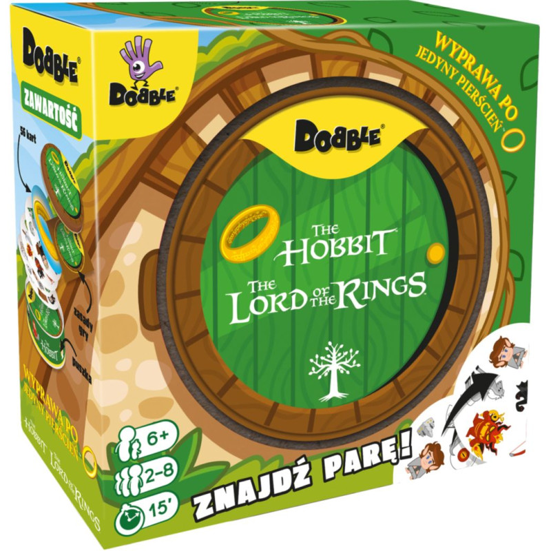 Zabierz Froda, Sama, Gandalfa oraz Smauga gdzie tylko zechcesz i baw się, szukając par w popularnej grze towarzyskiej! Spójrz na pierwszą kartę, którą trzymasz w ręku oraz na tę, która leży na środku stołu. Znajdź na nich wspólny symbol, nazwij go i szybko pozbądź się swojej karty. Teraz następna! Tylko nie zwątp, dwie karty zawsze łączy dokładnie jeden wspólny obrazek!