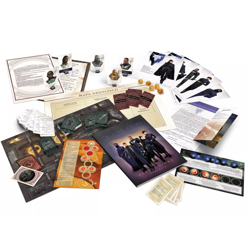 Niniejszy zestaw zawiera wszystko, co potrzebne, aby zacząć zabawę bez żadnych dodatkowych przygotowań. Nawet jeśli pierwszy raz odkrywacie świat Diuny czy gier fabularnych, pomoże wam on rozegrać niezapomnianą historię, w której to wasze postaci będą bohaterami.