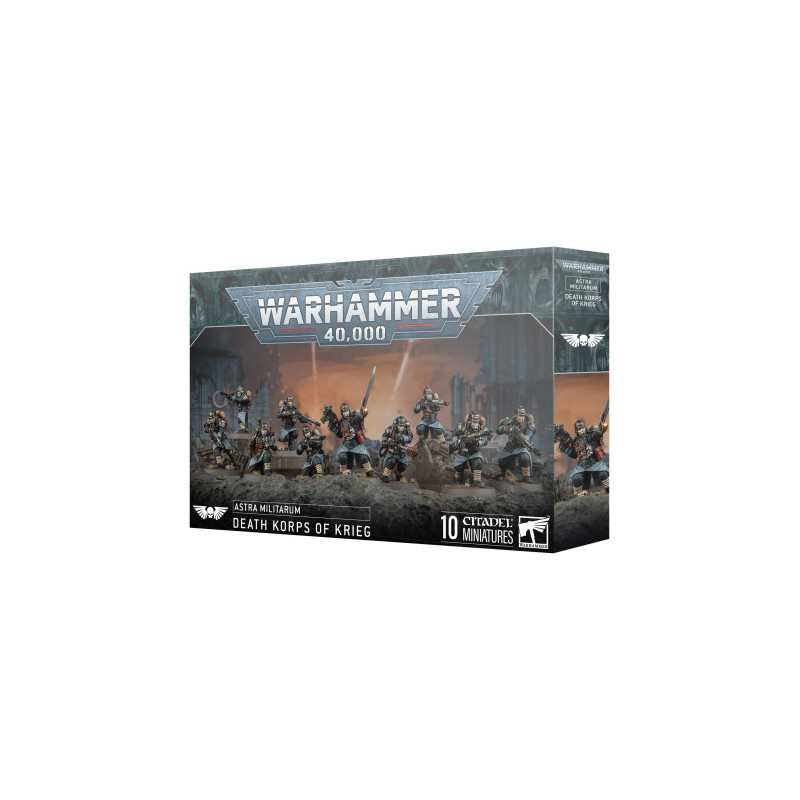 This multipart plastic kit builds 10 stalwart Death Korps of Krieg troopers for your Astra Militarum armies in games of Warhammer 40,000. Armed with utilitarian lasguns and equipped with gas masks, they are ready to enter the meatgrinder of war.