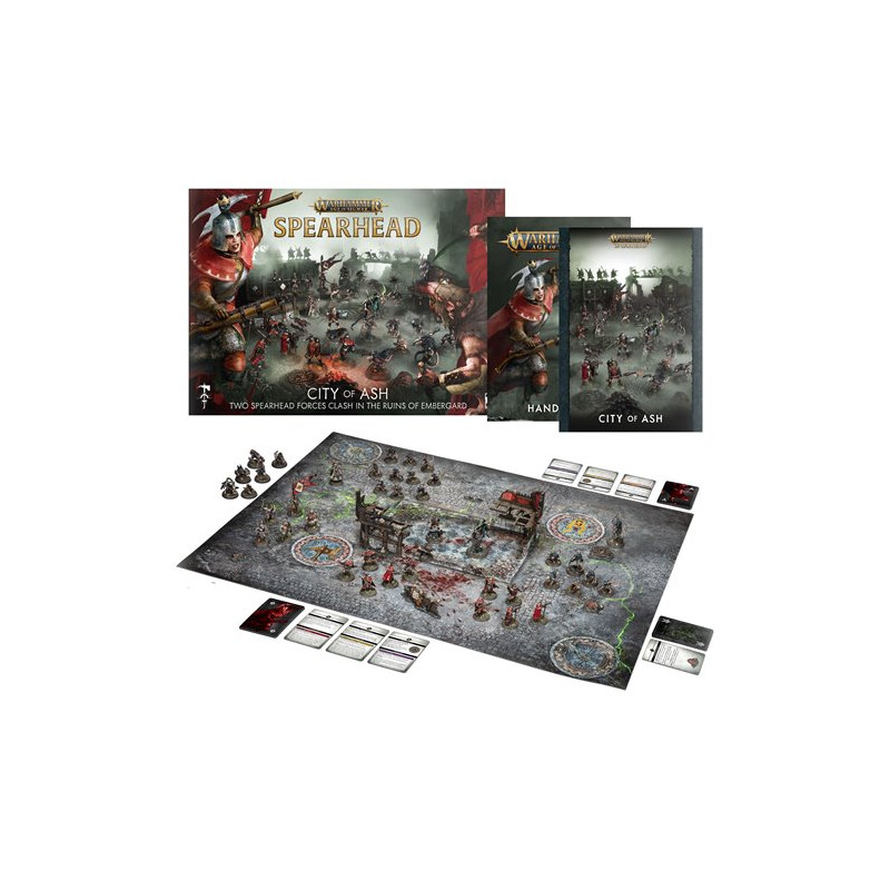 The stalwart Freeguild warriors of the Cities of Sigmar clash with the Skaven of the Clans Eshin, deadly assassins who lurk in the shadows of the ruined city. Take the plunge into Warhammer: Age of Sigmar with the City of Ash boxed set. It contains two full, balanced Spearhead armies, a board to play on, scenery pieces, and the books and cards you'll need to play fast-paced, action-packed games.