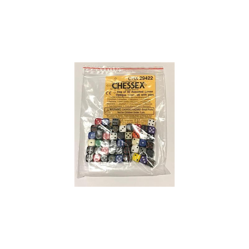 Zestaw kości Chessex Opaque Bags of 50 Asst. Dice - Loose Opaque 12mm d6 w/pips Dice